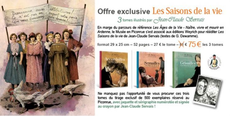 | Les Âges de la Vie, naître, vivre et mourir en Ardenne », la nouvelle publication du Musée en Piconrue est en souscription temporaire au prix de 15€ au lieu de 19 jusqu’au 15 janvier 2016. D’autre part, les trois volumes des « Saisons de la vie » illustrés par Jean-Claude Servais et rédigés par G. Dewamme sont également proposés à un prix intéressant. Plus d'informations sur le site du Musée |